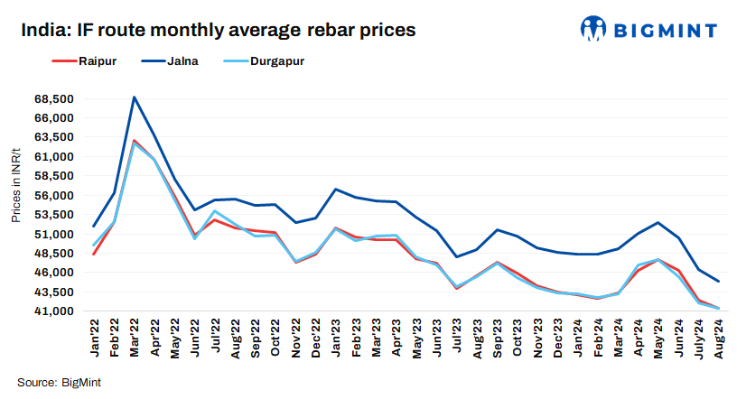 India’s induction furnace (IF)-route rebar prices remained under pressure in August 2024. Rebar (Fe 500) prices dropped in the range of INR 200-1,700/tonne (t) m-o-m as per BigMint data.