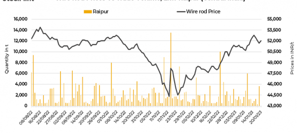 Limited buying enquiries: Wire rod purchase enquiries and trades were limited in the spot market throughout the week as buyers’ interest declined at higher offer prices. Need-based buying was observed in the market from distributors’ end as deals for around 9,150 t were recorded in Raipur market by SteelMint during the week. However, active lifting and dispatching of previously booked orders reduced the inventory pressure on the suppliers.