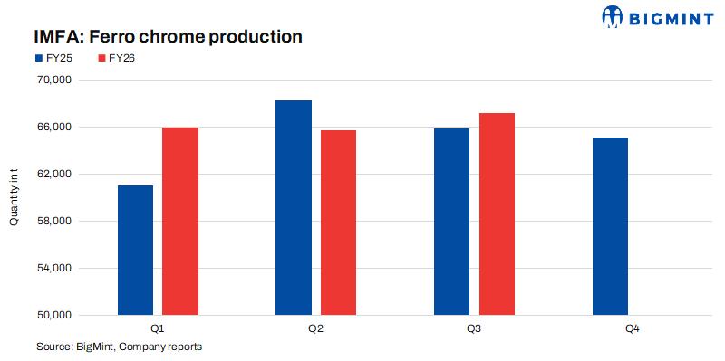 Indian Metals & Ferro Alloys Ltd (IMFA) reported ferro chrome production of 67,196 t in Q3FY’26, up 2% q-o-q from 65,671 t in Q2FY’26. Chrome ore output, however, increased sharply by 57% q-o-q to 265,468 t, supported by improved realizations, stable operating costs. The Kalinganagar expansion and Tata’s plant acquisition are set to enhance capacity and make IMFA India’s largest ferro chrome producer.