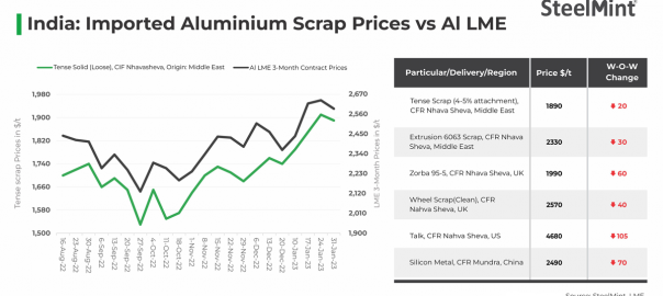 According to SteelMint, landed prices of US-origin imported aluminium scrap at around INR 171,000–172,500/t including price rationalisation, taxes and other charges like freight/CHA, etc. compared to INR 167,000-169,000/t for domestic scrap exy Delhi, excluding GST.