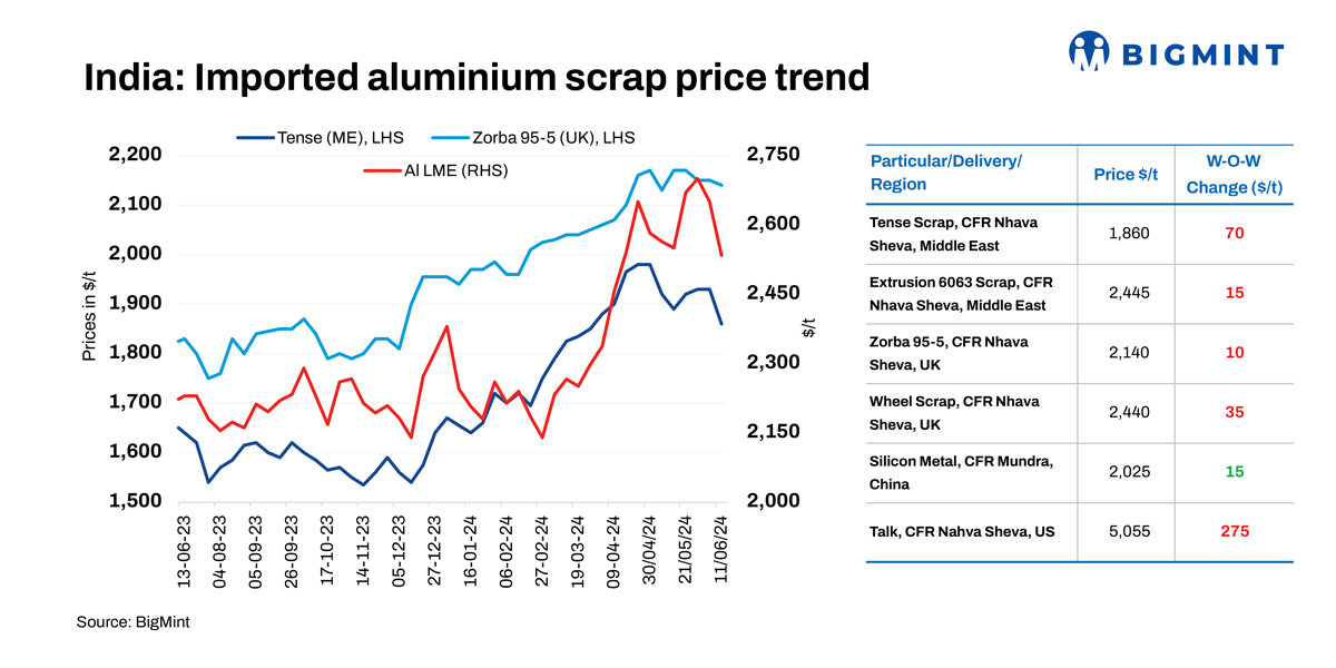 Aluminium scrap prices in India have remained on downtrend w-o-w. According to BigMint’s assessment, Tense scrap price from the US were down by $50/t to $1,920/t while taint tabor prices (USA, HRB-3%) were at $2,025/t after correcting $50/t.
