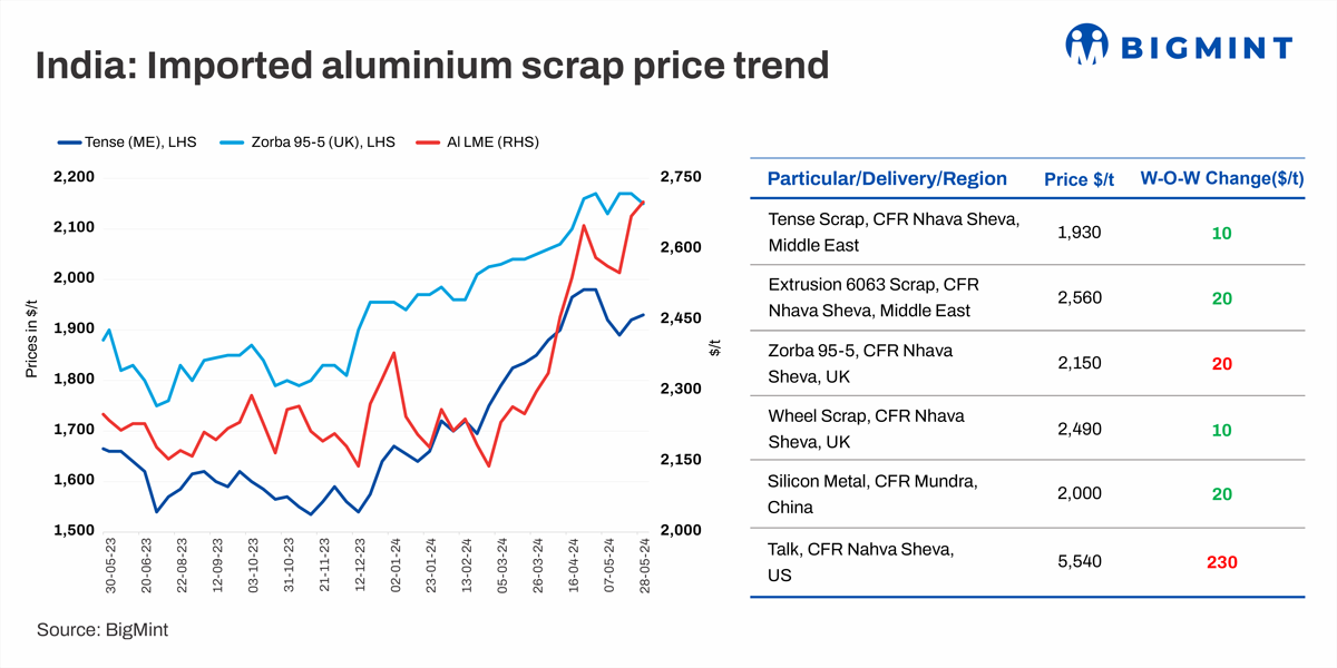 Aluminium scrap prices in India have remained almost stable w-o-w. According to BigMint’s assessment, Taint Tabor prices (USA, HRB-3%) remain stable at $2,040/t. Prices of Tense scrap from the US were slightly up by $10/t at $1,970/t. LME aluminium prices at the time of reporting remained rangebound at around $2,700/t.