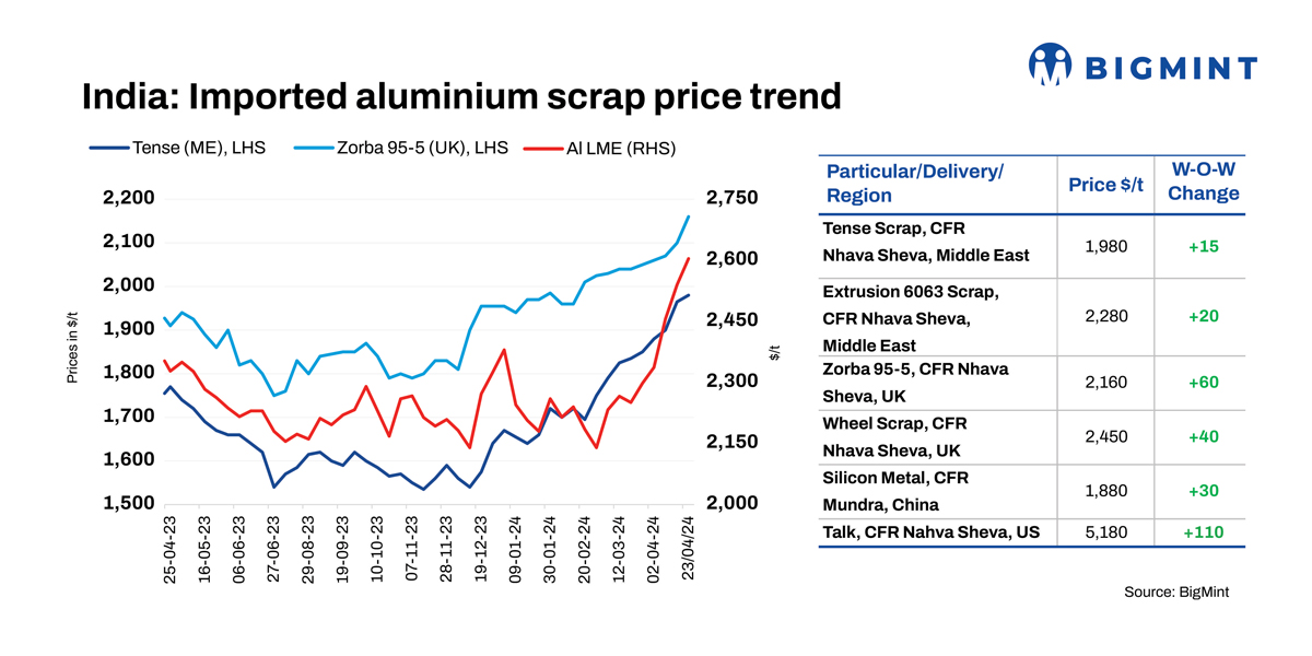According to assessments by BigMint, aluminium imported scrap prices in India have risen by up to 2.9%, aligning with the upward trend in aluminium futures. Tense scrap from the USA rose by $20/t to reach $2,000/t, while zorba 95/5, of UK origin, moved up by $60/t settling at $2,160/t CFR Mundra.
