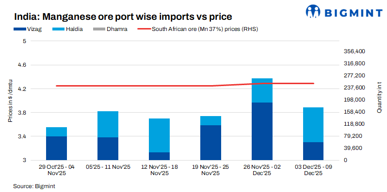 Imported cargo arrivals fall w-o-w: Weekly manganese ore cargo arrivals (Mn37%, Mn44%, and Mn46%) to India decreased by 35% to 172,779 t over 3-9 December against 267,797 t in the previous week.