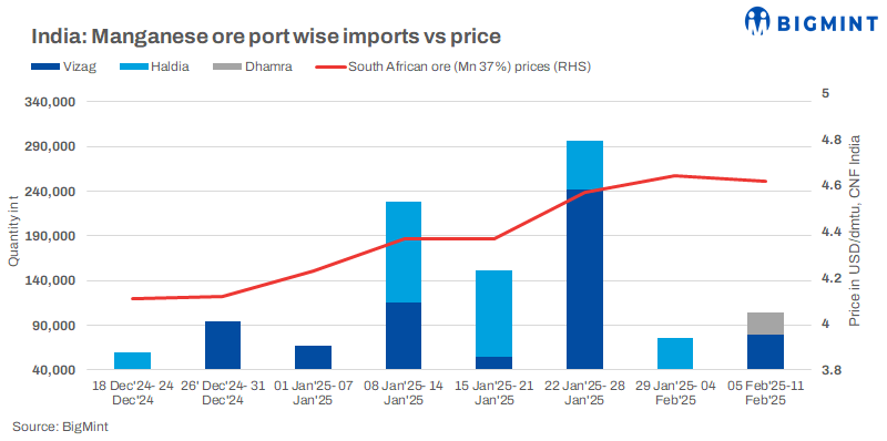 Weekly cargo arrivals rise w-o-w: Manganese ore imports to India increased by 37% w-o-w, with shipments totalling 103,924 t between 5-11 February, 2025.
