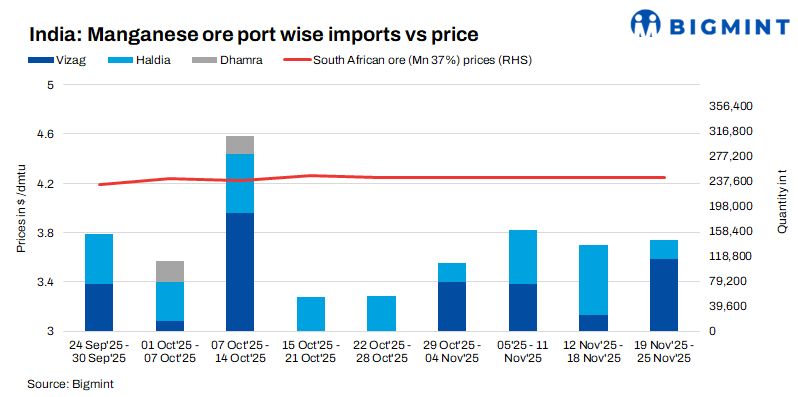 Imported manganese ore prices into India rose in the week ended 5 December for high-grade material, while the Mn 37% grade continued to remain unchanged week-on-week. The modest improvement in high-grade prices encouraged smelters to engage in strategic buying to secure raw material amid market uncertainty. At the same time, limited availability of imported ore at portside locations added further support to prices, reinforcing a firmer sentiment in the spot market.
