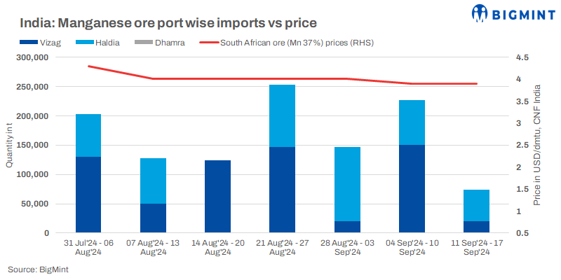 Import arrivals fall w-o-w: Manganese ore imports to India decreased by 68% w-o-w, with shipments totalling 73,490 t between 11 September and 17 September compared to 226,288 t in the previous week.