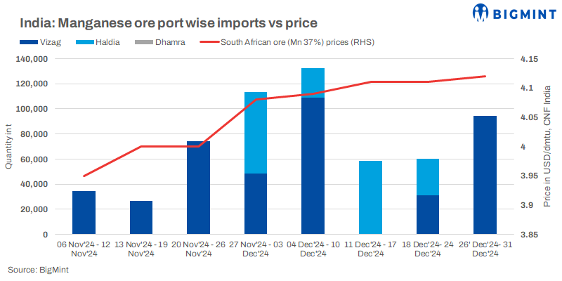 Import arrivals rise by 57% w-o-w: Manganese ore import arrivals to India increased by 57% w-o-w, with shipments totalling 94,400 t over 25-31 December compared to 60,207 t in the previous week.