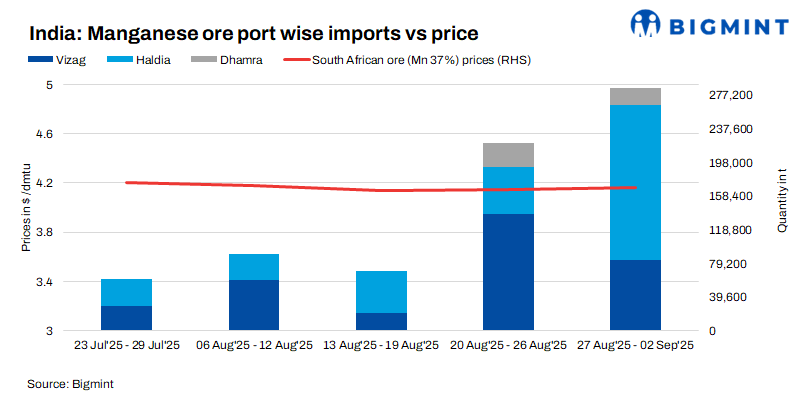 Imported cargo arrivals fall w-o-w: Weekly manganese ore cargo arrivals to India increased by 29% (Mn37%, Mn44%, and Mn46%) to 285,683 t over 27 August-02 September 2025 against 221,083 t in the previous week.