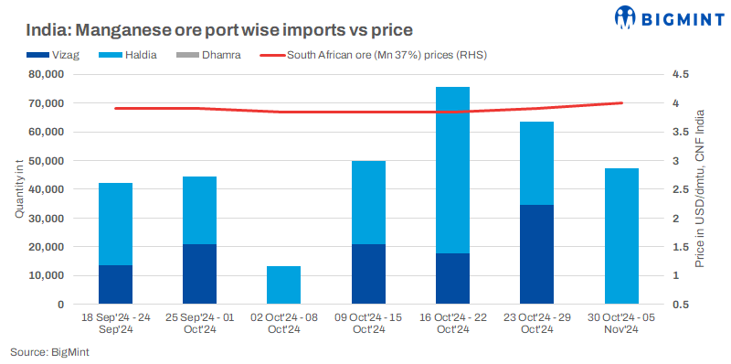 Weekly cargo arrivals drop: Manganese ore imports to India decreased by 26% w-o-w, with shipments totaling 47,176 tonnes between 30 October and 5 November, 2024).