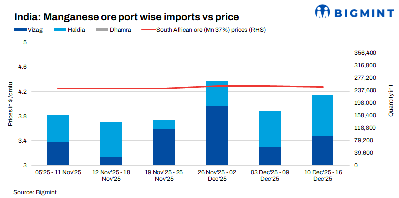 Imported cargo arrivals rise w-o-w: Weekly manganese ore cargo arrivals (Mn37%, Mn44%, and Mn46%) to India increased by 29% to 223,069 t over 10-16 December against 172,779 t in the previous week.