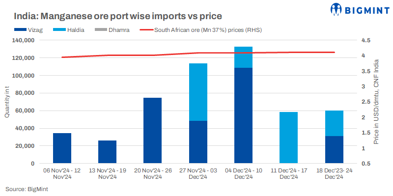 Import arrivals edge up w-o-w: Manganese ore import arrivals to India edged up by 3% w-o-w, with shipments totalling 60,207 t between 18 and 24 December compared to 58,536 t in the previous week.