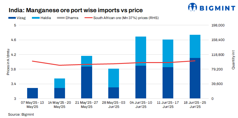 Weekly cargo arrivals in India up w-o-w: Manganese ore imports into India increased by 8% w-o-w, with shipments totalling 171,891t between 18-24 June compared to last week.