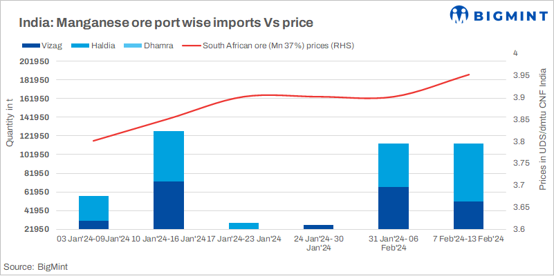 Imported cargo arrivals remain stable w-o-w: India cargo arrival has shown a flat graph in manganese ore (Mn37%, Mn44%, and Mn46%) weekly import shipments, reaching 114,060 t between 7 February 2024-13 February 2024, compared to the previous week’s 113,465 t. The weekly import volume of manganese ore has been primarily influenced by the concern of rising price and stoking up the material at the current price.