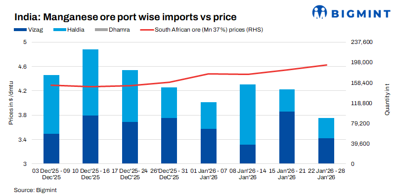 Indian imported manganese ore prices showed a mixed trend this week, even as manganese alloy prices moved on an upward trajectory. However, recent price hikes announced by key miners for March 2026 deliveries helped keep ore prices largely stable, with only marginal w-o-w fluctuations.
