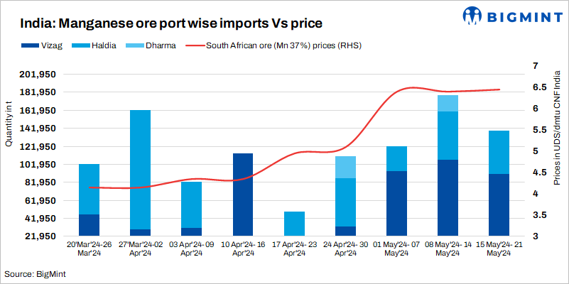 Weekly arrivals of imported cargoes fall by 22% w-o-w: Manganese ore cargo arrivals in India witnessed a decrease of 22% for Mn 37%, Mn 44%, and Mn 46 grades. This comes after a previous week with higher volumes, with weekly shipments reaching 139,539 t between 8 -14 May, 2024, compared to 178,514 t. This decline reflects a shift in buying patterns by smelters, who are now strategically acquiring lower volumes due to an uncertain market outlook.