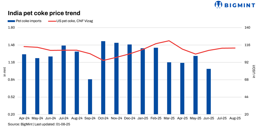 Imported pet coke offers in India dropped by $3/t w-o-w but largely remained above $110/t. US-origin cargoes were heard in the $110-120/t CFR range, while Saudi-origin ones stood at $109-111/t. While buyers showed interest in concluding deals at these levels, actual trading remained limited, as monsoon disruptions and cautious sentiment weighed on demand.