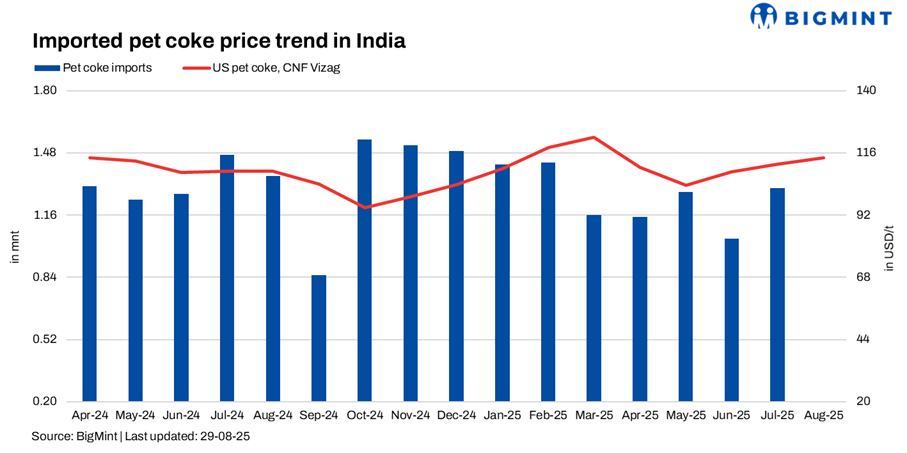 Imported pet coke offers in India remained steady w-o-w, with US-origin offers assessed at $114-115.5/t CFR and Saudi-origin at $112-114/t. Most offers sat above $115/t, leading to no trades concluded, as buyers remained cautious about these high levels. With demand muted, most participants adopted a wait-and-watch stance; activity is expected to recover gradually after the monsoon as infrastructure-sector buying picks up.