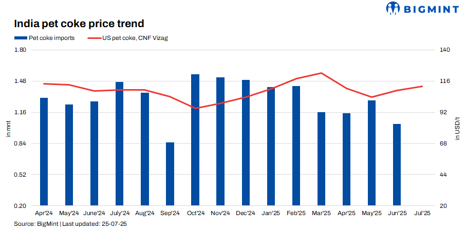 India’s imported pet coke offers rose $2-3/t w-o-w, driven by higher freights amid continued monsoon disruptions. US-origin cargoes were heard at $113-115/t CFR, while Saudi-origin stood at $112-114/t. However, demand was subdued, as buyers resisted elevated prices. Offers above $116-118/t lacked takers, reflecting cautious sentiment. While fundamentals were stable, the freight-driven increase kept CFR levels firm, limiting transactions in the current off-season.