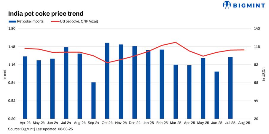 Imported pet coke offers in India remained stable w-o-w. US-origin cargoes were heard in the $110-120/t CFR range, while Saudi-origin ones stood at $109-111/t. Demand remained sluggish due to monsoon-related disruptions in construction activity. However, with freights firming up and infrastructure demand likely to pick up post-monsoon, traders expect buying interest to rise in Sep’25 for Oct’25 deliveries, especially from cement manufacturers.