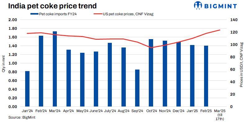 Imported pet coke prices in India dropped by $2-3/t w-o-w, with west coast tags at $119-121/t CFR and east coast at $120-122/t CFR. Saudi offers declined following reduced Chinese buying, while US offers also fell. Prices may drop further, pressured by weak demand, easing supplier offers, and limited trade activity.