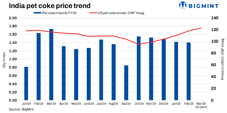 Imported pet coke prices in India declined by $1-2/t w-o-w. West coast offers fell to $117-118/t CFR, while east coast prices dropped to $119-120/t CFR. Saudi coke remained firm due to increased Chinese buying amid tariffs on US pet coke. However, the downtrend may halt in the days ahead, and prices may remain firm, with US sanctions on China-linked vessels restricting global shipping capacity.