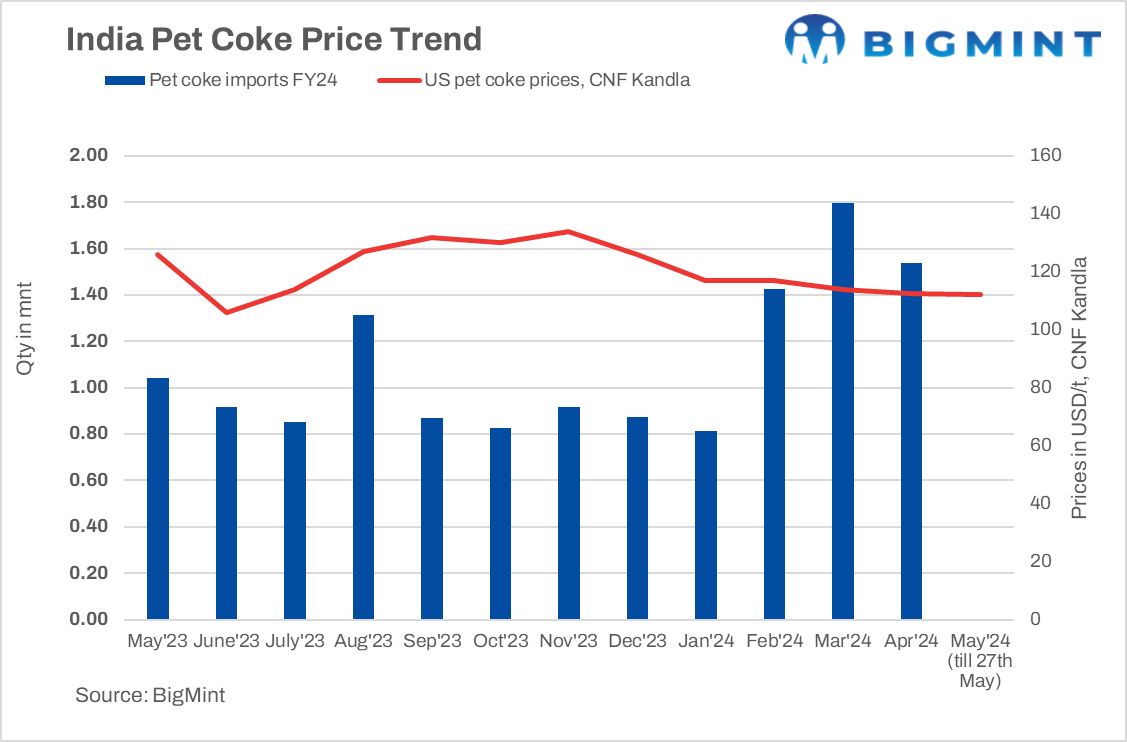 Prices of pet coke (S6.5) are in the range of $110-111/t, CFR west coast of India, edging down w-o-w. Due to the ongoing general elections, domestic consumption has slowed down somewhat. However, with elections concluding by early June, the demand for pet coke is expected to increase as construction activity intensifies ahead of the monsoon.