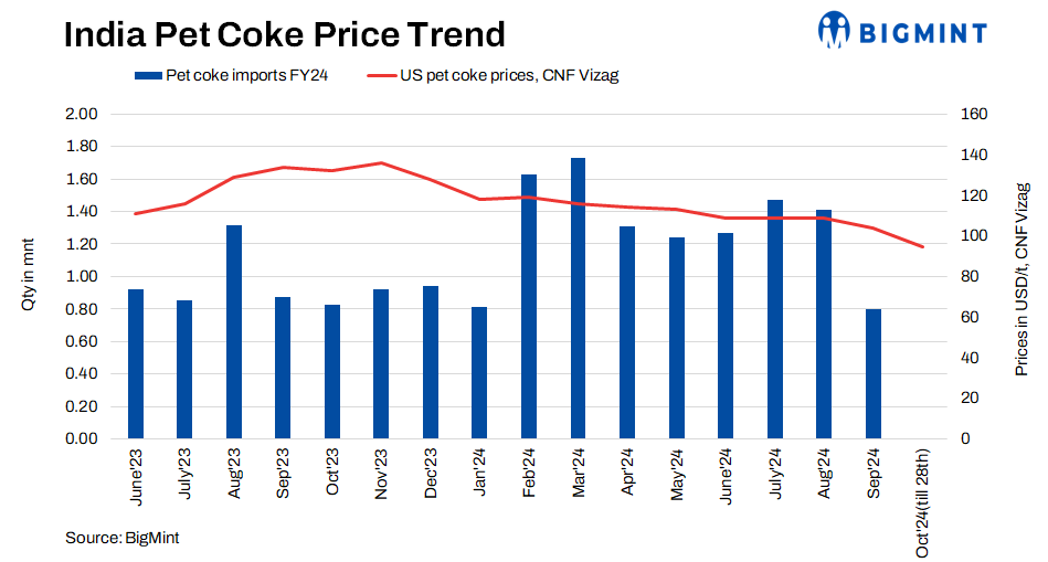 Prices of imported pet coke (6.5% S) were assessed at $95-96/t CFR west coast India and $97-98/t CFR east coast, up by $2-3/t w-o-w. Market participants informed that prices picked up as demand was seen from Indian buyers. Besides, one key Saudi mine shutdown has also contributed to the rise in prices this week.