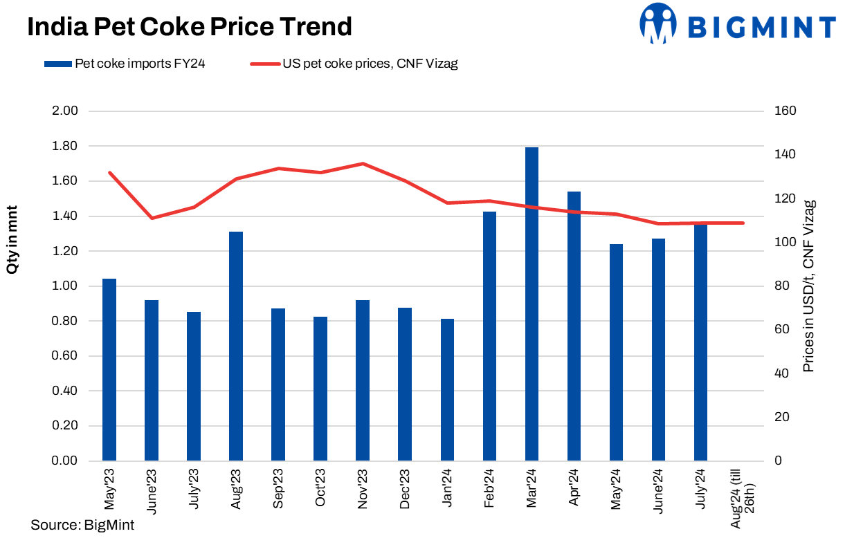 Prices of imported pet coke (6.5% S) in the international market have inched down this past week to a 1-month low. Notably, these were assessed in the range of $106-107/t CFR west coast and $108-109/t CFR east coast, India. Prices may follow a declining trend on reduced demand and the ongoing rains in the country.