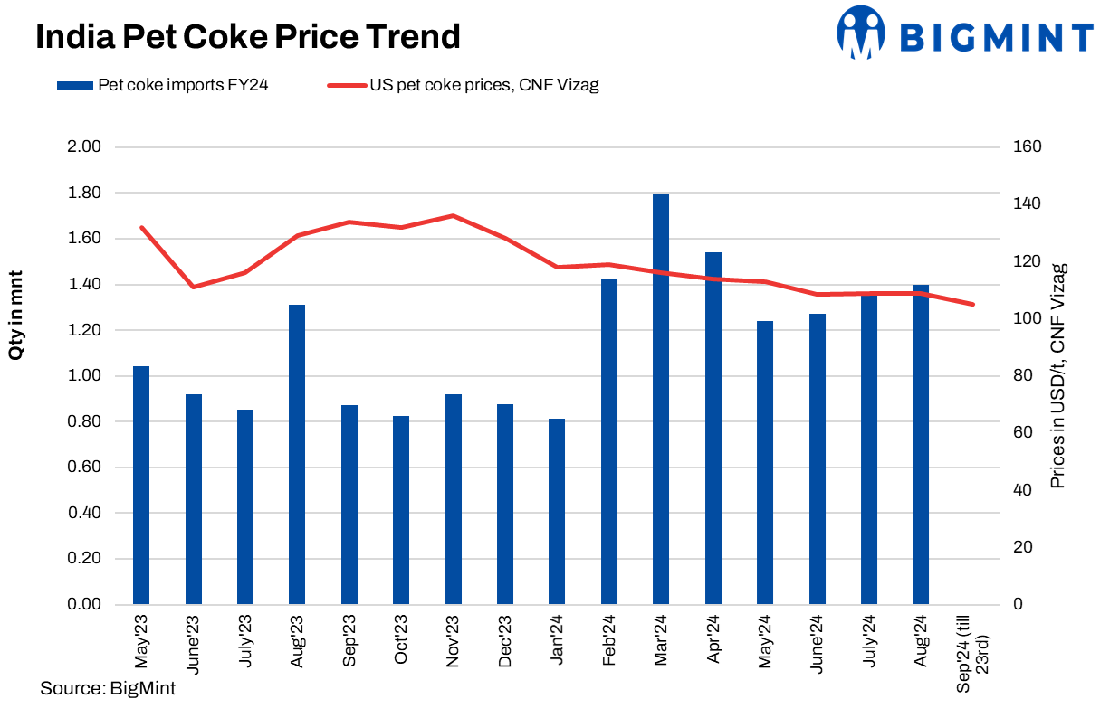 Prices of imported pet coke (6.5% S) in the international market remained unchanged this week. They were assessed at $103-104/t CFR west coast and $104-105/t CFR east coast, India. Prices are under pressure amid reduced buying interest from India and China.