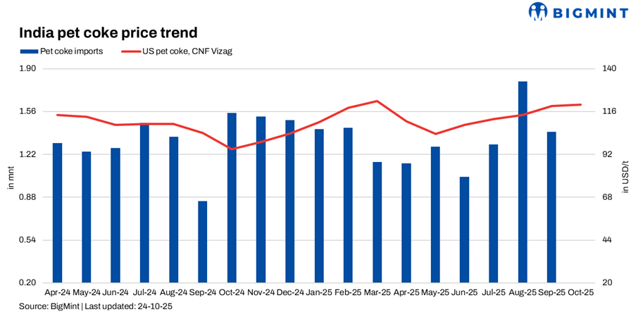 Imported pet coke prices in India remained unchanged w-o-w, as trading activity stayed muted through the extended festive holidays. Sellers largely maintained offers, with limited fresh inquiries. BigMint assessed US-origin material at $118-120/t CFR and Saudi-origin coke at $117-119/t CFR. Market participants expect activities from Indian cement players to pick up as they begin booking cargoes for November.