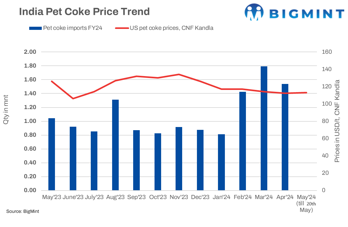Prices of pet coke (S6.5) are in the range of $111-112/t CFR west coast of India, majorly stable w-o-w. Domestic consumption has slowed down a bit due to the ongoing general elections. As the elections are coming to an end by early June, the demand for pet coke may again firm up due to increased pressure for construction activity to complete before monsoon.