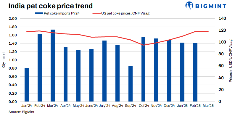 Imported pet coke prices in India remained stable w-o-w, with west coast offers steady at $117-118/t CFR and east coast prices also unchanged at $119-120/t CFR. However, prices may rise in the next 2-3 weeks as buyers ramp up procurement ahead of the monsoon season, potentially tightening supply and supporting an uptrend.