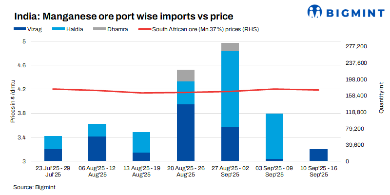 Imported cargo arrivals to India fall: Weekly manganese ore cargo arrivals to India decreased by 75% (Mn37%, Mn44%, and Mn46%) to 28,650 t over 10 -16 September against 114,999 t in the previous week.