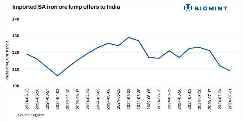 South African iron ore lump (Fe 64%) import offers decreased by $3/t w-o-w to $109/t CNF Kandla on 31 Jul’24. No cargo has been booked by Indian buyers for lumps yet but following the current market sentiments and inquiries, deals may conclude in the near term. Iron ore (Fe62%) fines spot prices fell by $1/t w-o-w to $99/t CFR China on 30 July.