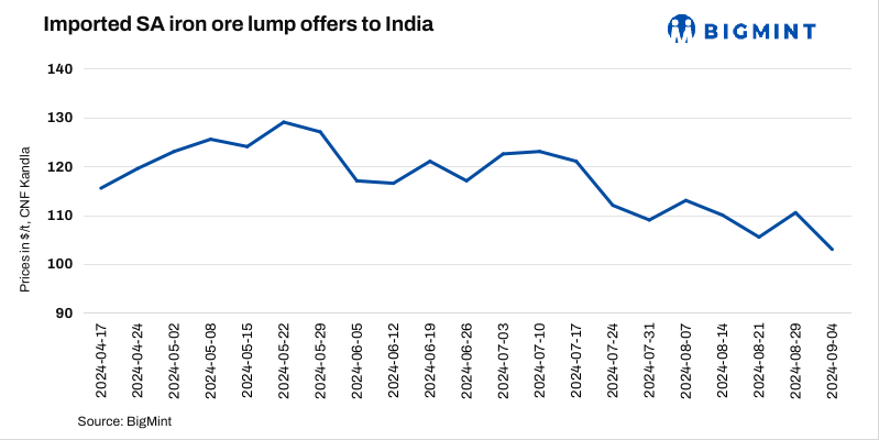 South African iron ore lump (Fe 64%) import offers declined by $7.5/t w-o-w to $103/t CNF Kandla on 4 Sep’24. Prices fell following a w-o-w drop in spot and futures prices of iron ore fines. Inquiries remained few even after prices dropped due to competitive pellet offers in Gujarat. Global iron ore fines (Fe 62%) prices also decreased by $8/t w-o-w to $93/t CFR-China on 3 Sep.