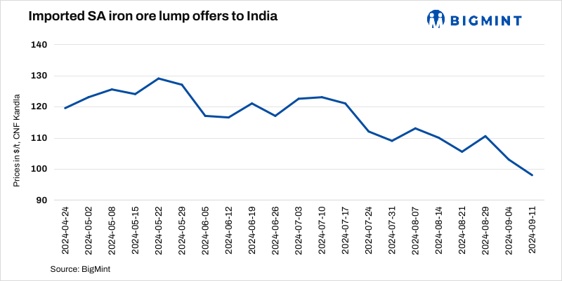 South African imported iron ore lump (Fe 64%) offers declined over twenty months by $5/t w-o-w to $98/t CNF Kandla today. This drop has reached a hedging level for importing into India. However, major buyers remain out of market due to prevailing bearish market sentiments. Global iron ore fines (Fe 62%) prices decreased by $3/t w-o-w to $90/t CFR China on 10 September.