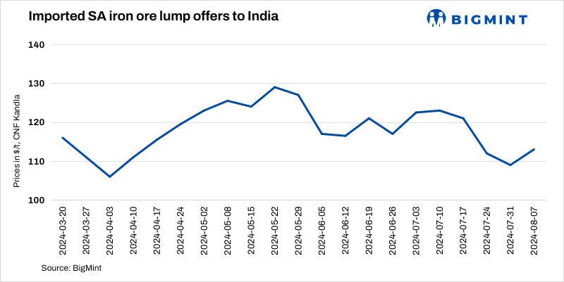 South African iron ore lump (Fe 64%) import offers increased by $4/t w-o-w to $113/t CNF Kandla on 7 Aug’24. Indian buyers are still not ready to take any position in the market and there may not be any bookings till September. Iron ore (Fe62%) fines spot prices rose by $3/t w-o-w to $102/t CFR China on 6 Aug.