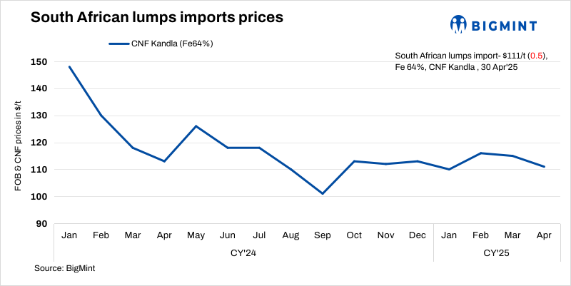 South African iron ore lumps (Fe64%) import offers in India inched down by $0.5/t w-o-w to $111/t CNF Kandla on 30 Apr’25. Import deals were absent on the west coast, but the market is expecting to see inquiries in the near term. China’s seaborne spot prices of iron ore (Fe 62%) fines remained stable w-o-w at $99/t CFR on 29 Apr.