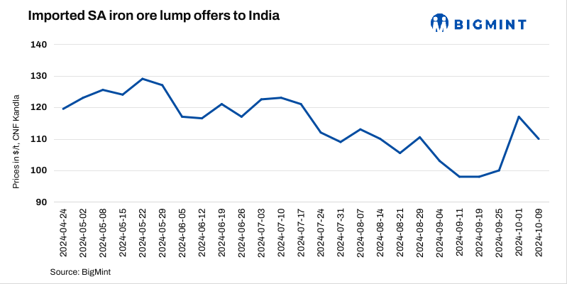 South African imported iron ore lump (Fe 64%) offers fell by $7/t w-o-w to $110/t CNF Kandla today. No demand was observed for imported lumps from mills in western India due to competitive domestic pellet prices and low interest from international iron ore traders. Global iron ore fines (Fe 62%) prices fell by $3/t w-o-w, reaching $105/t CFR China as of 9 October.
