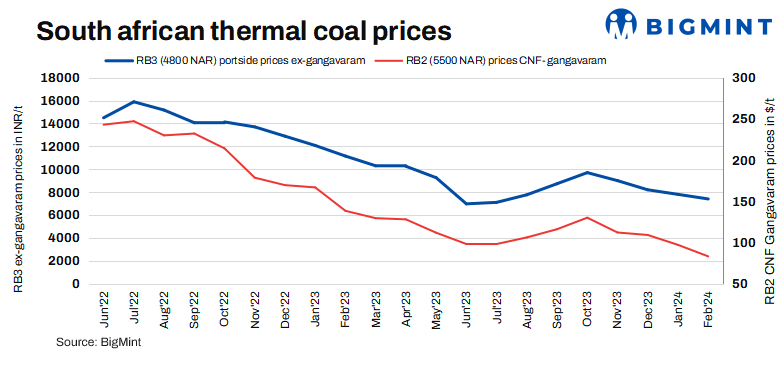 In the Asian thermal coal market, prices witnessed a w-o-w decline amid increased domestic production and tepid demand. Prices for RB3 (4800 NAR) coal at Gangavaram Port were recorded at INR 7,800/, dropped by INR 400/t. Furthermore, monthly prices dropped by INR 800/t as compared to INR 8,200/t in January 2024.