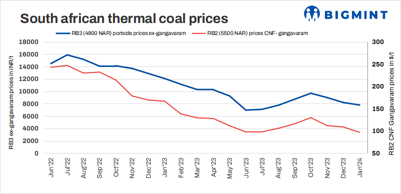 The South African thermal coal import market is on the verge of a downturn in the short term, primarily due to sluggish demand from sponge iron producers. Moreover, the resumption of coal transportation services, which will enhance supply and alleviate congestion at the Richards Bay Terminal, are expected to contribute to a decline in prices.