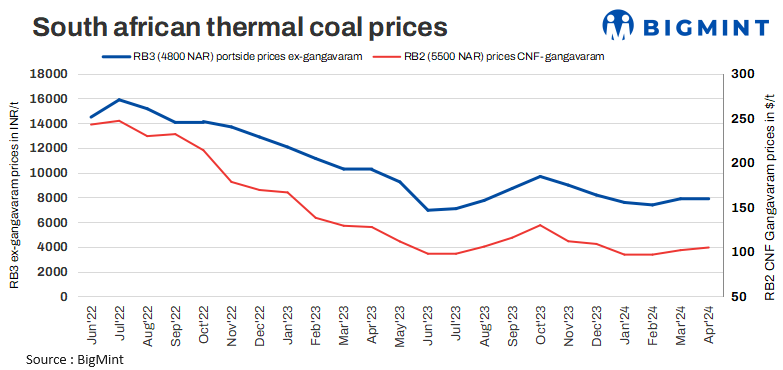 In the Asian thermal coal market, prices of RB2 (5500 GAR) remained stable w-o-w to INR 9,400/t ex- Gangavaram. However, Prices for RB3 (4800 NAR) coal at Gangavaram Port were recorded at INR 7,900/, remained unchanged w-o-w. Furthermore, monthly prices of RB2 (5500 GAR) rose by INR 100/t as compared to INR 9,300/t in March 2024.