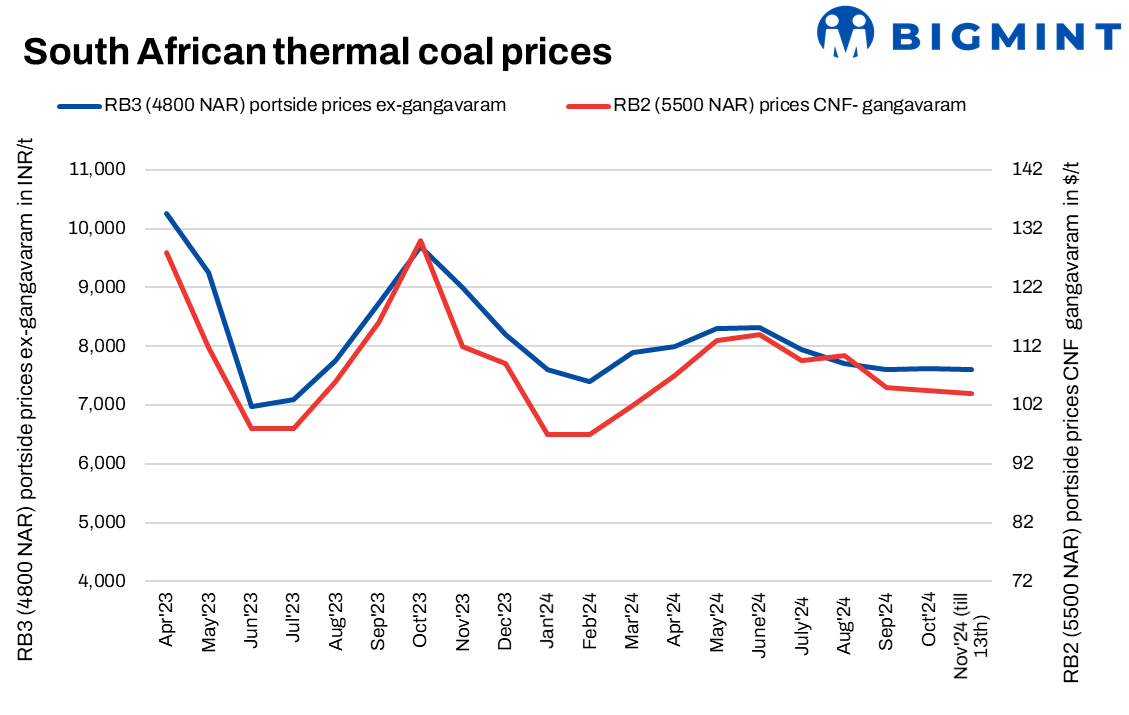 Portside prices of South African thermal coal remained stable w-o-w, as per BigMint’s assessment. RB2 (5500 NAR) and RB3 (4800 NAR) prices were assessed at INR 9,500/t and INR 7,600/t ex-Gangavaram, respectively. A deal of 7,000-t RB3 was heard concluded at INR 7,700/t ex-Gopalpur, with the seller’s offer reportedly higher than prevailing levels.
