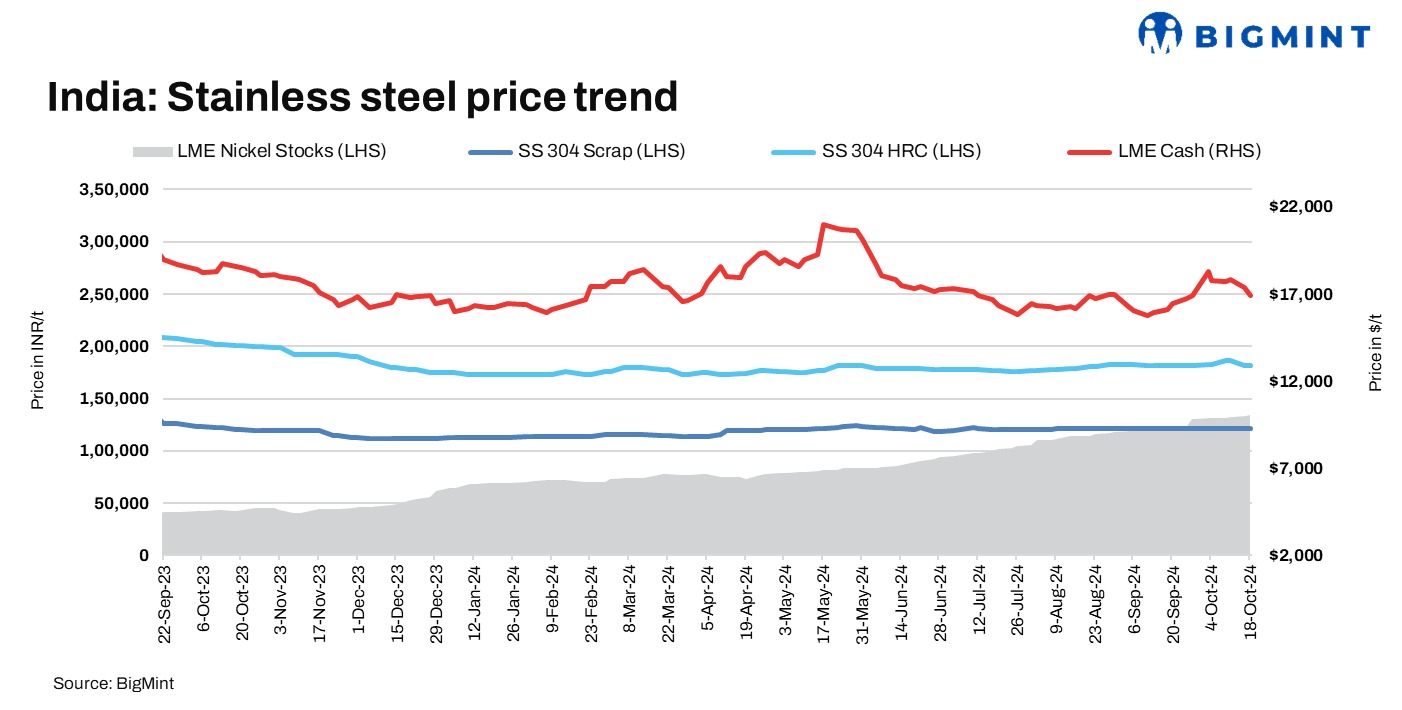 Stainless steel scrap prices are expected to experience a slight decline in the near term, influenced by falling LME nickel levels. However, domestic trading activity will likely remain low to moderate due to the upcoming festivities, with market participants predicting a demand recovery only after Diwali.