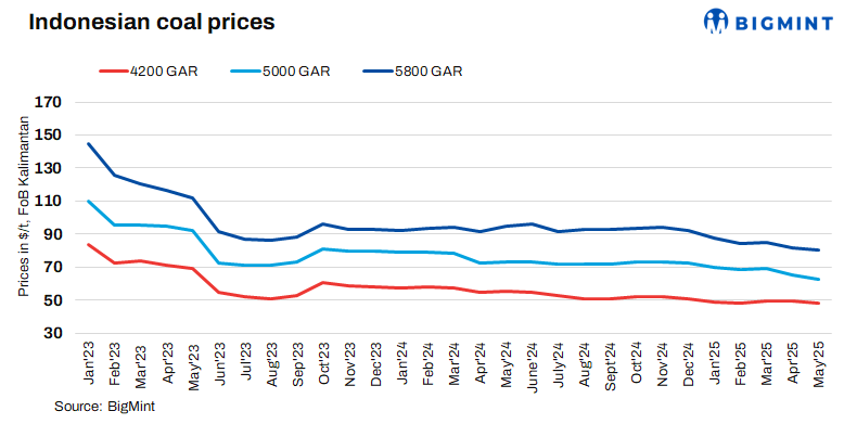As of 2 May 2025, thermal coal prices across major Indian ports held firm. The 5000 GAR grade remained steady at INR 7,800/t at Kandla, while 4200 GAR coal was quoted at INR 6,200/t in Kandla and INR 6,100/t in Vizag. However, 3400 GAR coal prices fell by INR 100/t to INR 4,800/t at Navlakhi. Reasonable supply from different locations kept Indonesian prices under pressure.