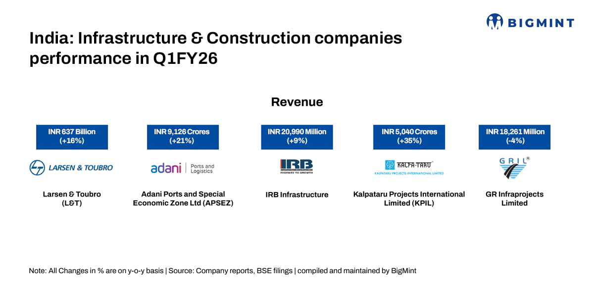 India’s infrastructure sector showed strong momentum in Q1FY26, with companies such as Larsen & Toubro (L&T), Adani Ports and Special Economic Zone (APSEZ), IRB Infrastructure, Kalpataru Projects International Ltd (KPIL), and GR Infraprojects (GRIL) reporting resilient performances. The quarter was marked by healthy order inflows, steady execution across transportation, logistics, energy, and urban infrastructure, and robust order book growth. These trends reinforce the sector’s role as a key driver of India’s economic expansion, with strong visibility for sustained growth in the coming quarters.