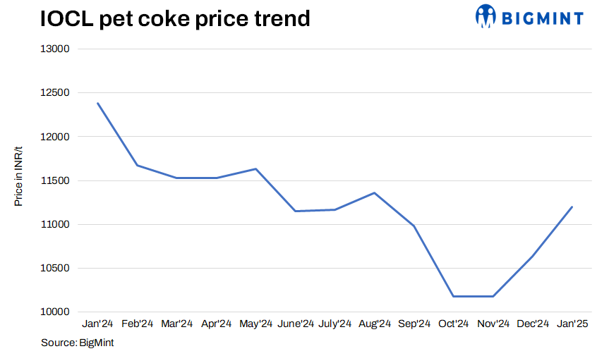 IOCL raised pet coke prices for Jan’25, effective 9 Jan. At Koyali, road delivery prices stood at INR 11,200/t and rake supply at INR 11,000/t, both up INR 560/t m-o-m. Panipat’s tags stood at INR 11,990/t (+INR 550/t), Paradip’s (road) at INR 10,430/t (+INR 560/t), and Haldia’s (road) at INR 10,600/t (+INR 560/t). Export prices for Nepal and Bhutan were hiked to INR 11,900-11,930/t.