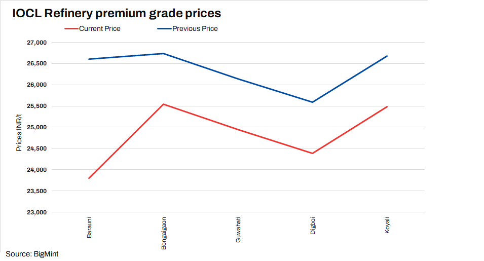 The price has decreased this month at all refineries by the same amount of INR 700/t except at Barauni whose prices dropped by INR 2,300/t.