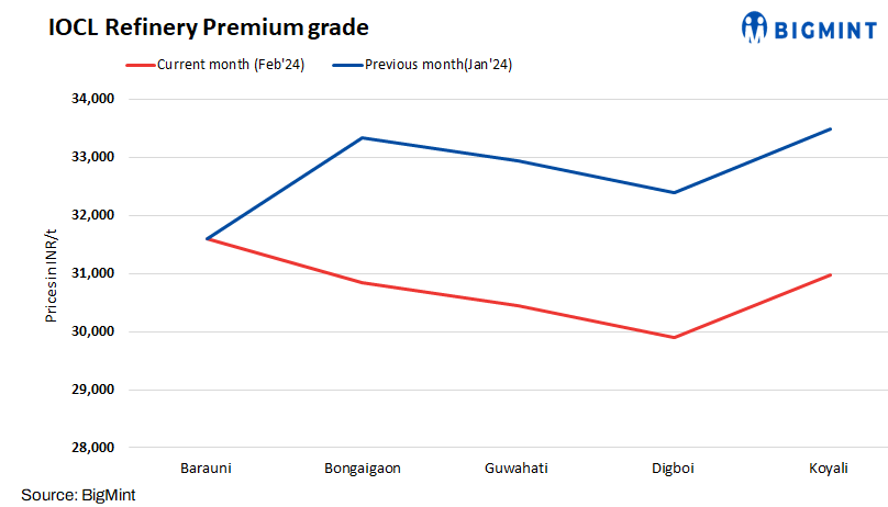 The price has decreased this month at all refineries by the same amount of INR 2,500/t except at Barauni where there was no change.